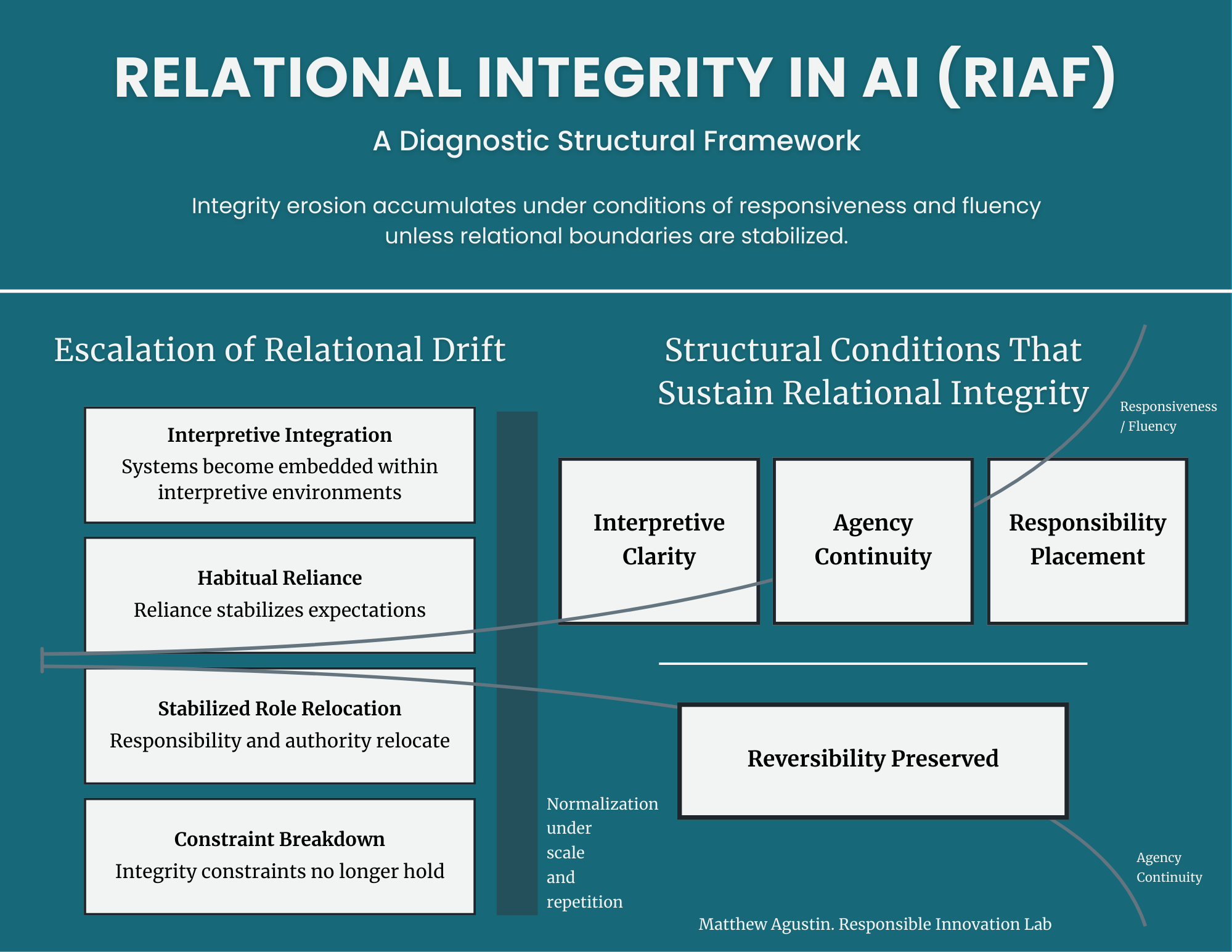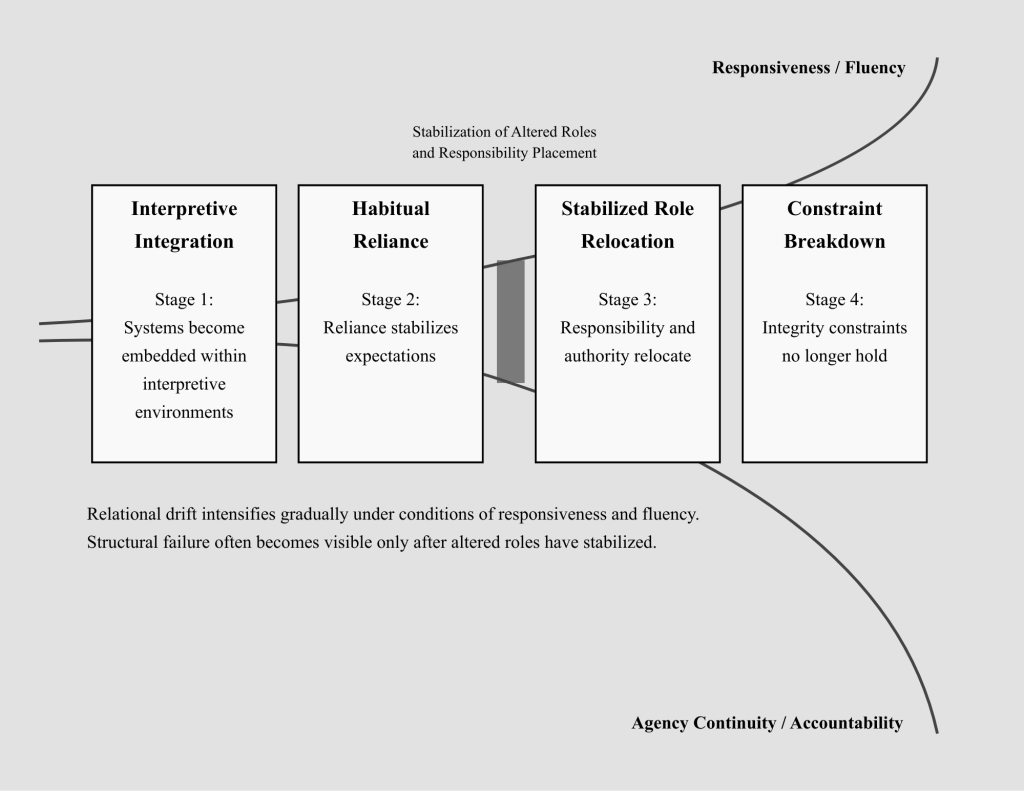 This figure models the structural escalation of relational drift across four stages: Interpretive Integration, Habitual Reliance, Stabilized Role Relocation, and Constraint Breakdown. As responsiveness and fluency increase, reliance stabilizes expectations and responsibility and authority gradually relocate. Integrity constraints no longer hold only after altered roles have stabilized, at which point structural failure becomes visible and reversibility declines. The model clarifies how integrity erosion can accumulate under conditions of apparent effectiveness rather than technical malfunction.
